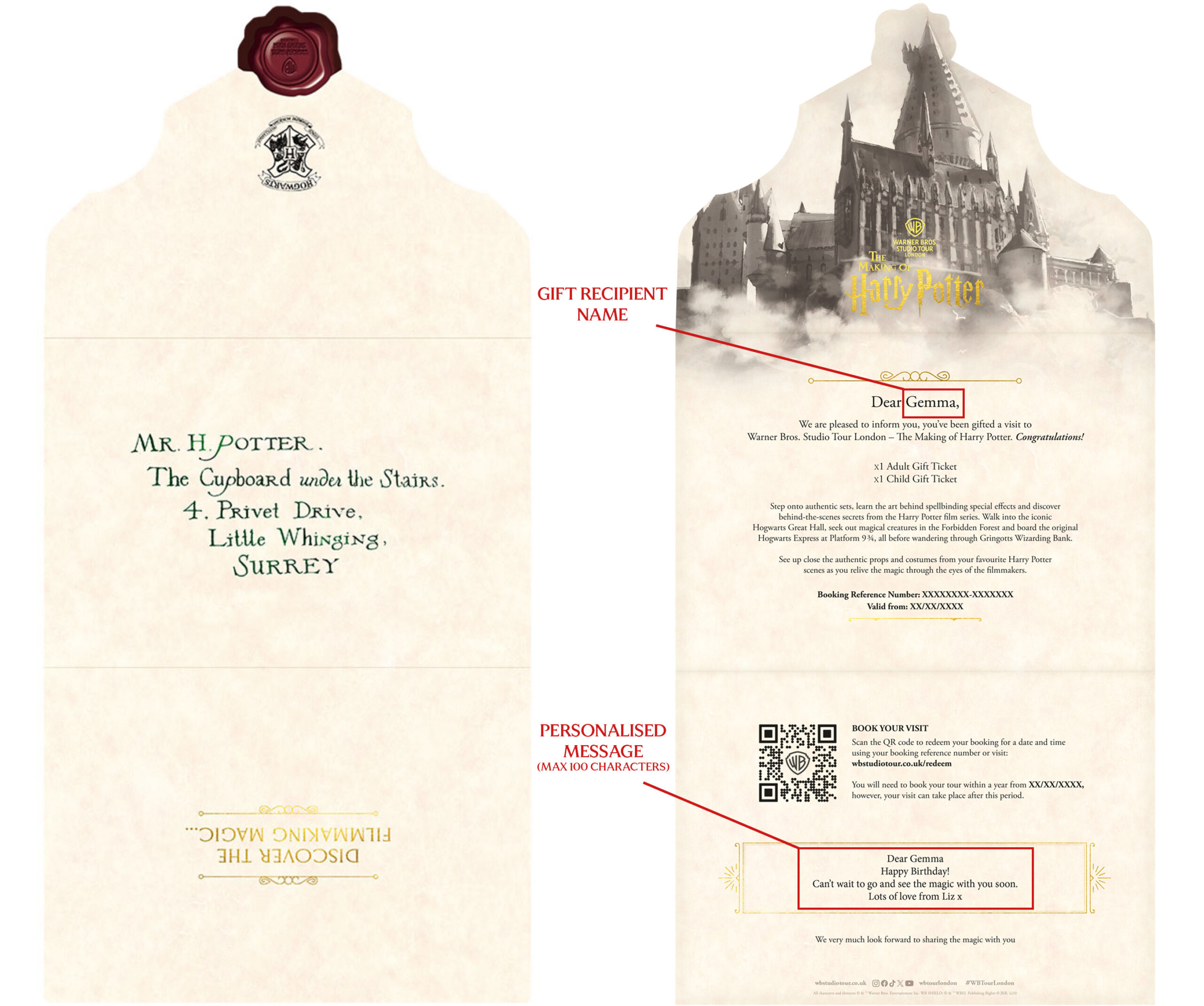 Our souvenir gift ticket is inspired by the Hogwarts Acceptance Letter. The envelope is addressed to Mr. H. Potter at number 4 Privet Drive, and when unfolded reveals a beautifully crafted letter personalised to your gift recipient, including a short message from the gift giver. The letter will detail how many Studio Tour tickets have been gifted and instructions on how to redeem gift tickets online.